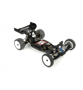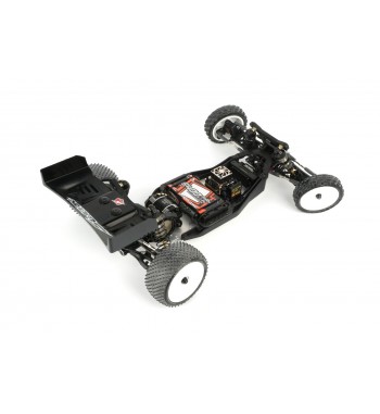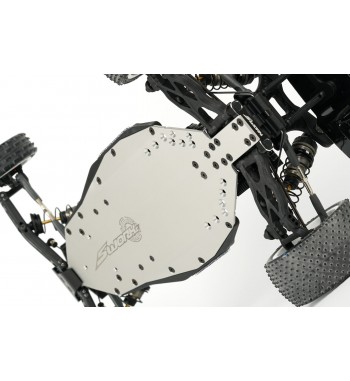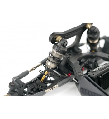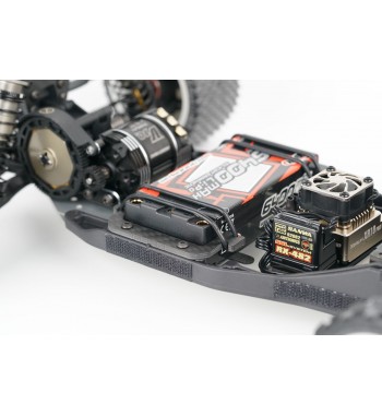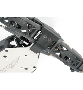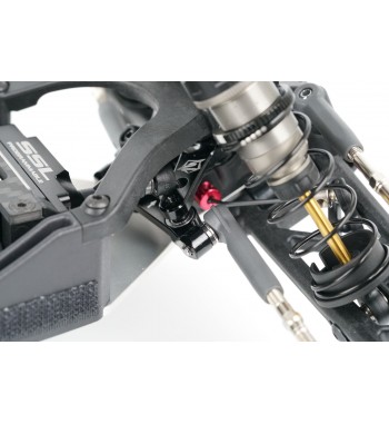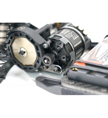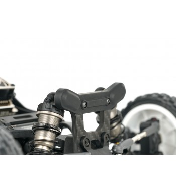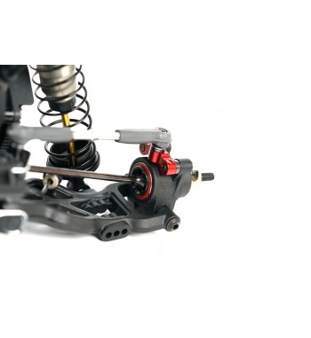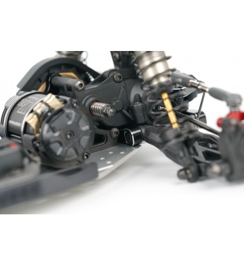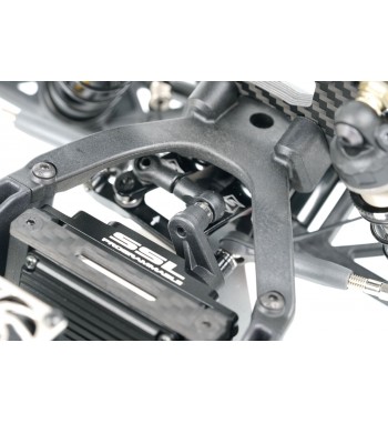 Angled lower arms lower the shock mounting position, reducing the center of gravity and improving stability. The gearbox has been optimized for ideal weight distribution, balancing size and strength. The rear hub height can be modified using the innovative Synthesis Rear Hub System and modular rear CVDs. A newly designed front and rear sway bar holder systems are included for enhanced cornering control.