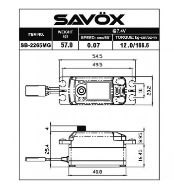 Das Savöx SB-2265MG Brushless Digital Servo Low Profil verbindet hohe Stellgeschwindigkeit sowie hohes Drehmoment. Perfekt für Helikopter sowie 1/10 and 1/8 Onroad und Offroadfahrzeuge. * Abmessungen: 40.8*20.2*25.4 * Gewicht: 49g * Spannung: bis 7,4V * Geschwindigkeit: (sec/60°): 0.08sec°/60 * Stellkraft: (kg-cm): 12.0 * Zahnräder: Metall * Gehäuse: Aluminium
